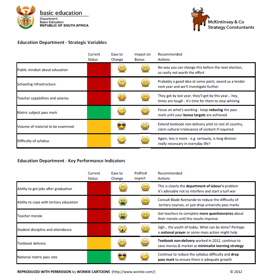 Since Wonkie is sometimes accused of being too negative, Wonkie decided it was high time to analyse and praise one of the ANC’s greatest success stories since taking power in 1994. Some in-depth investigative journalism actually revealed very little about the ANC education strategy. Trevor Manuel and Collins Chabane, the chaps irresponsible for planning and measurement against the government agenda were unavailable for comment. Rumour has it that they were busy strategising on the ANC 300 year plan, the first draft of which is rapidly approaching its March, 2040 deadline.